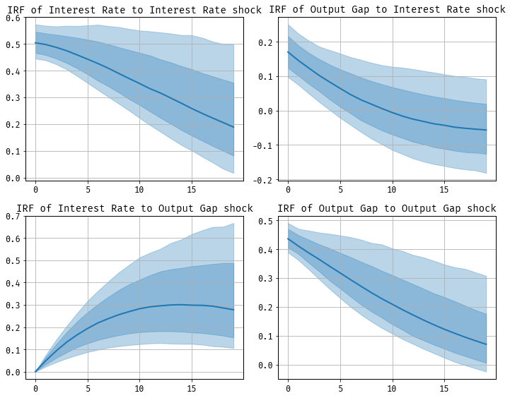 Note that this inverted structure still maintains the recursive identification. The matrix \(A_0^{-1}\) reflects the assumption that the policy variable (interest rate) does not respond contemporaneously to \(\epsilon_{2,t}\) while the output gap can be influenced immediately by both shocks \(\epsilon_{1,t}\) and \(\epsilon_{2,t}\).
