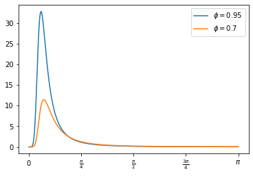 The spectrum for \(\phi=0.95\) and \(\phi=0.70\) is plotted in Figure 3. The spectrum peaks at about \(\pi/8\), which is associated with a cycle lasting about 16 quarters \(=(2\pi/(\pi/8))\). As \(\phi\) increases, this peak sharpens. So here the HP filter is introducing as spurious periodicity in our data.